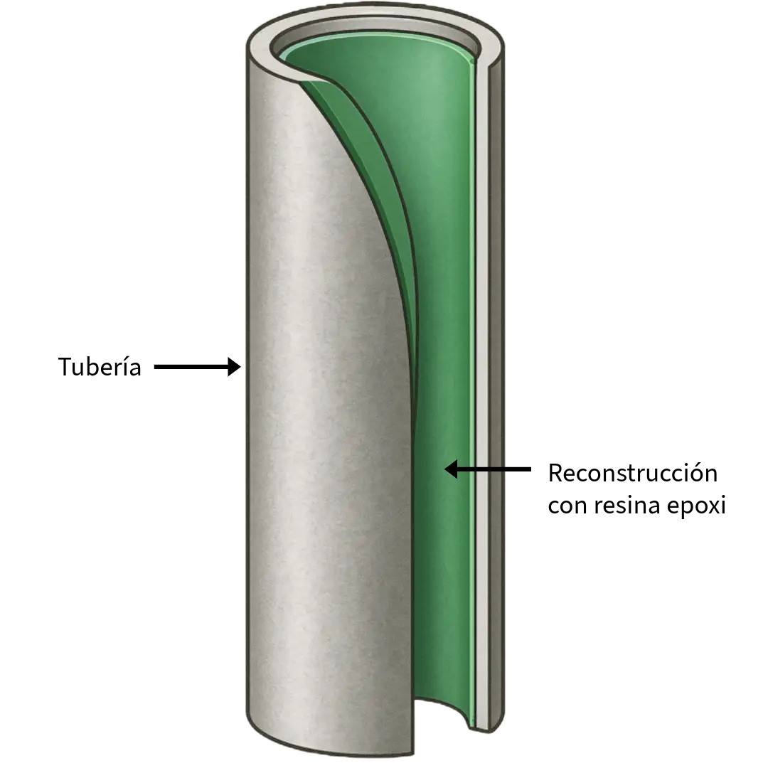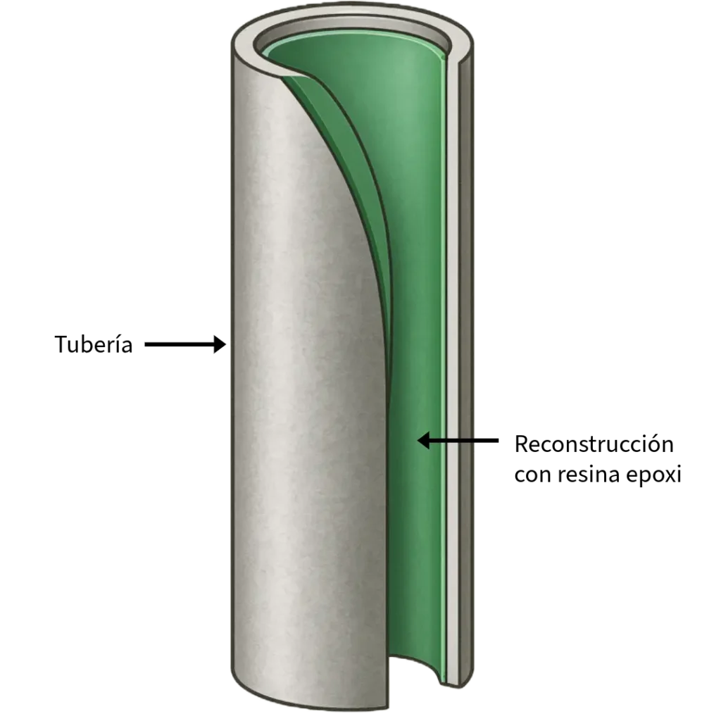 La reparación de bajantes sin obras consiste en rehabilitar el interior de la tubería sin necesidad de demoliciones. Primero se inspecciona el conducto con una cámara, luego se limpia en profundidad y finalmente se aplica una resina especial que se adhiere a las paredes internas, formando una nueva superficie estanca y resistente. Todo el proceso se realiza desde el interior, en pocas horas y sin molestias para los residentes.